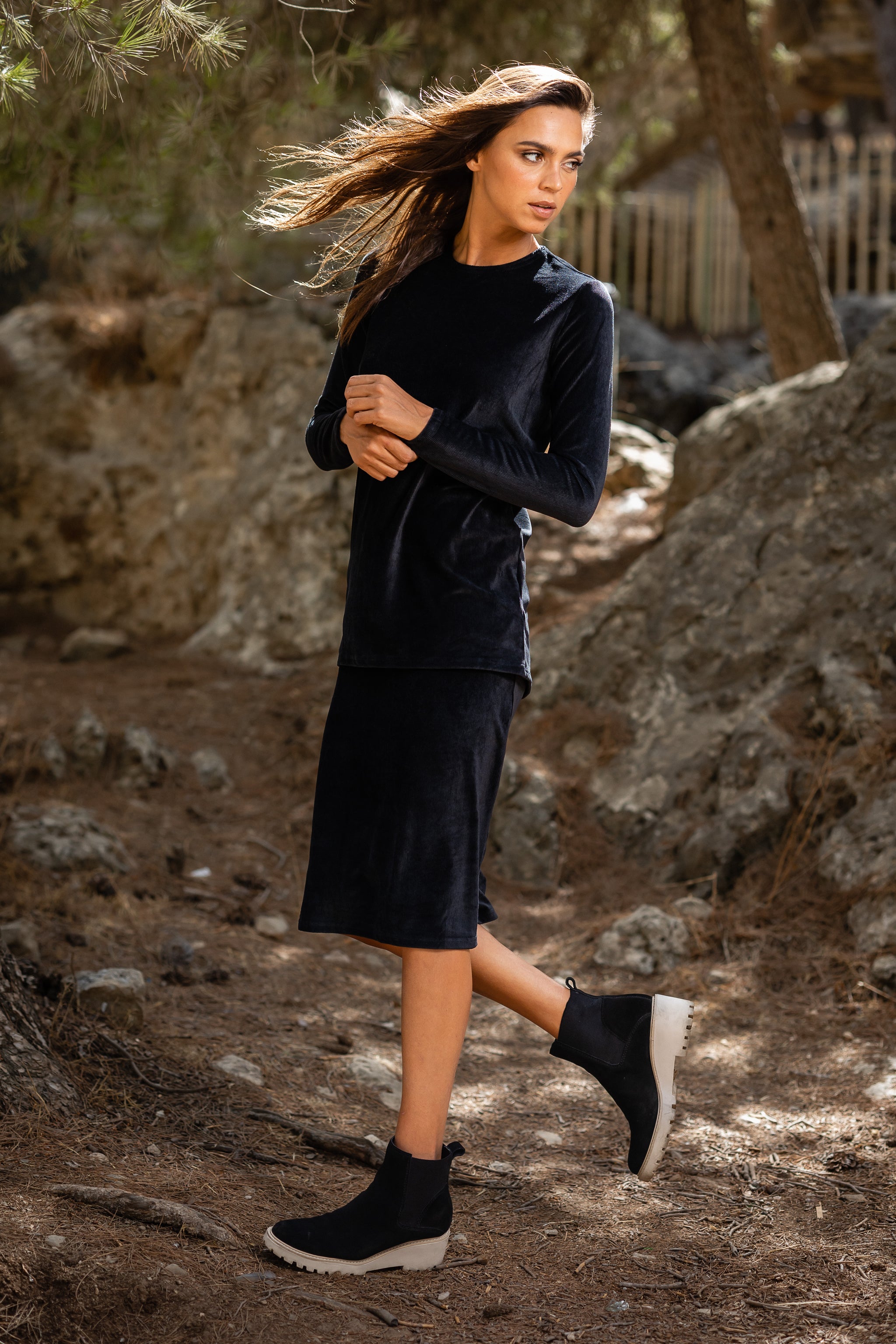 So soft and luxurious, our fine-ribbed velour pencil skirt feels like loungewear but it is so easy to dress up! Featuring a smooth drawstring waist, this silky velour skirt will take you from errands to a night out in no time! Any top will look great tucked in or out, but we think our matching velour top takes this skirt to the next level.