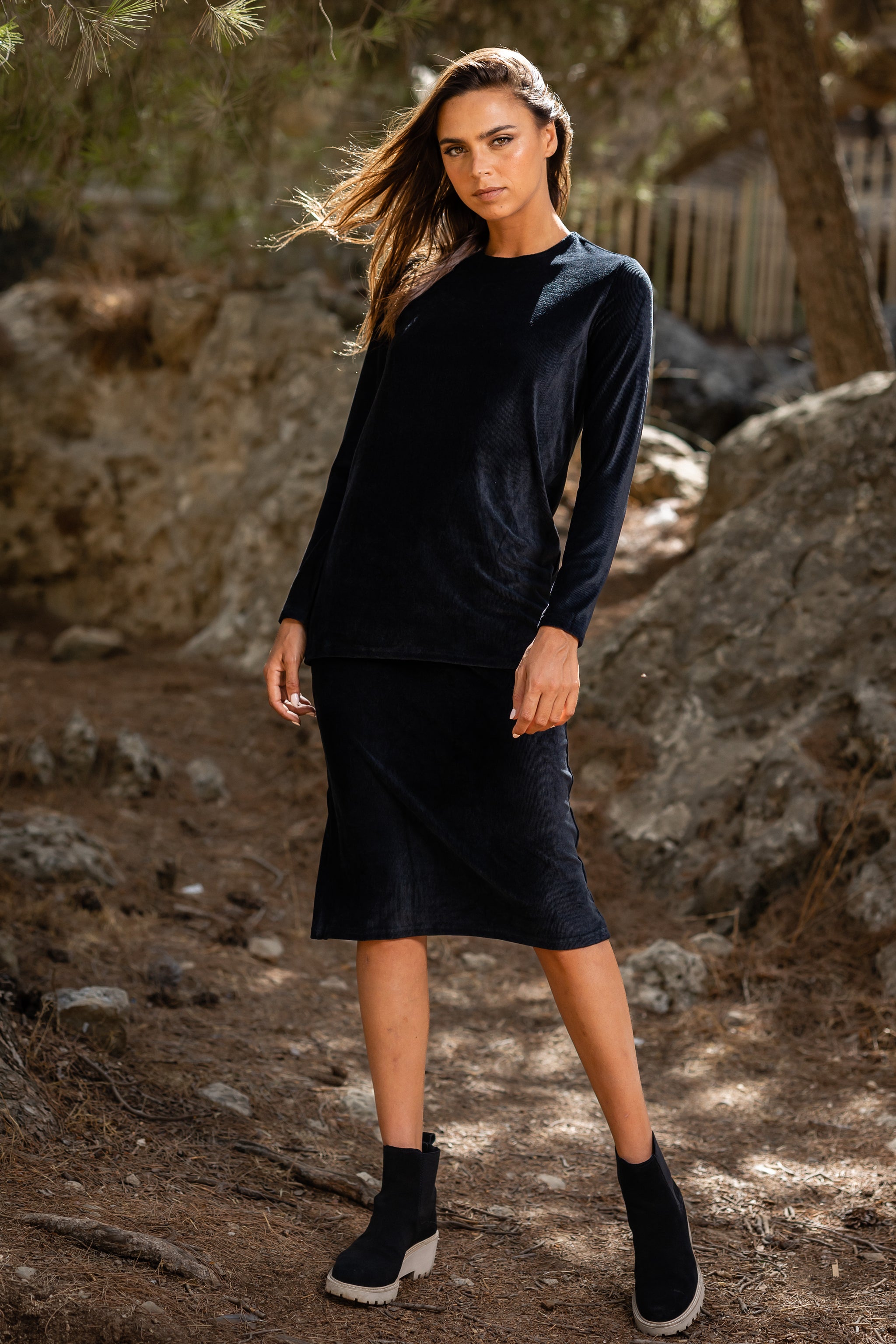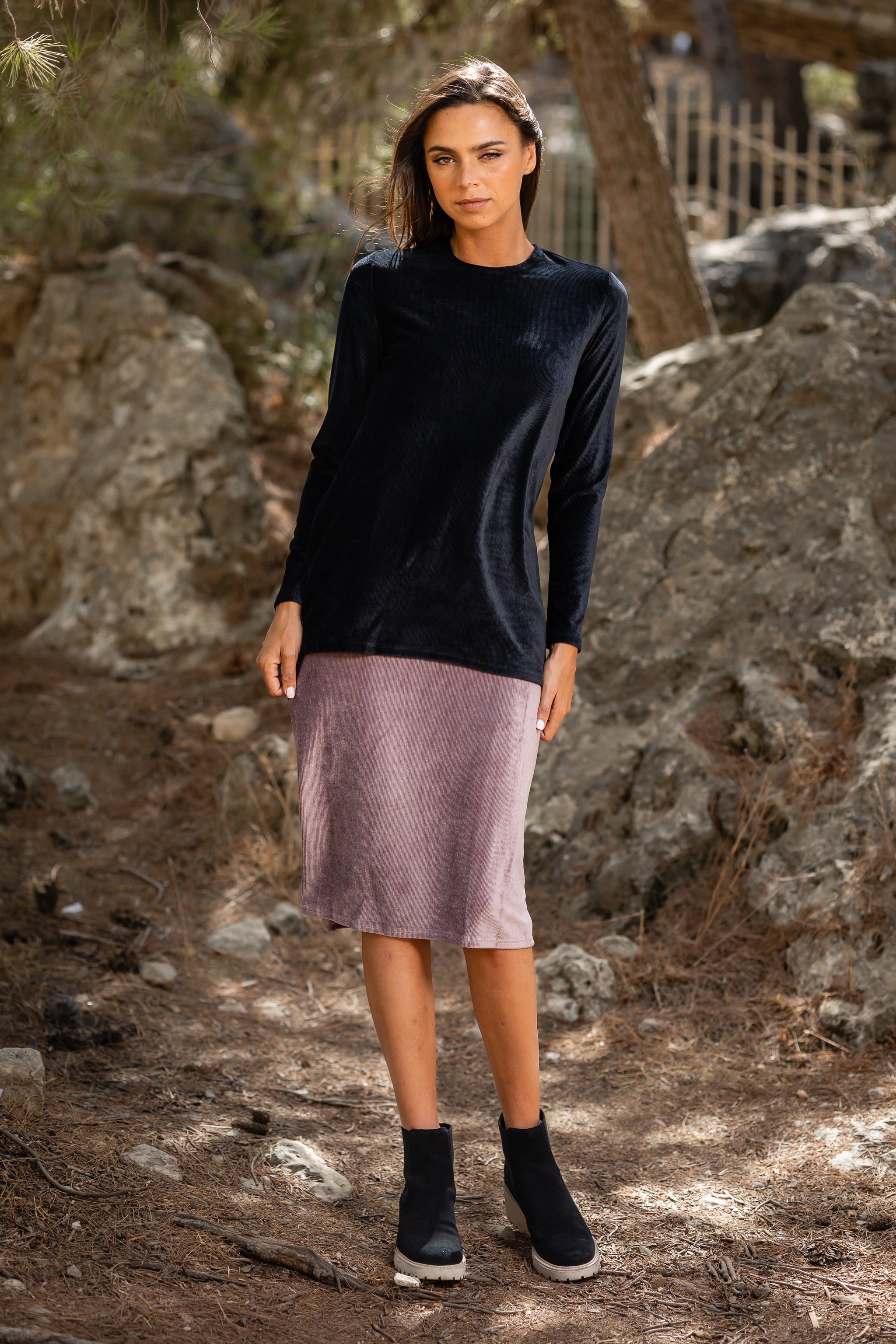 Our new fine-ribbed velour top is so soft and silky you won't want to take it off! The coziness of loungewear but so chic to style up. The high-low hem is perfect for tucking in or keeping out. This top is the perfect complement to our velour skirt, but it would be a showstopper with any bottom!