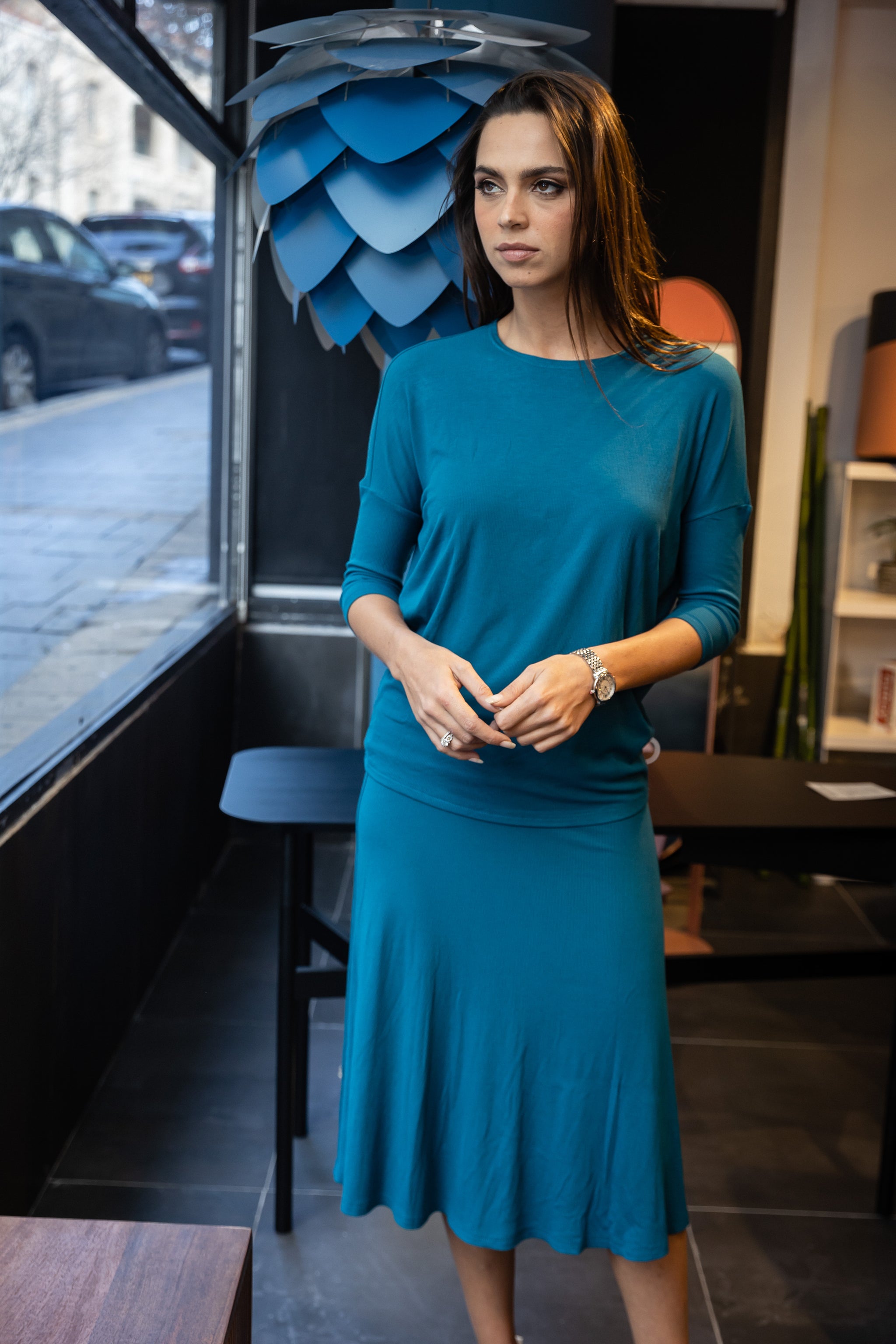 Our popular Dalia top is back and better than ever! This is the perfect top for your wardrobe! Cozy, ribbed material drapes and flatters beautifully. Pair this top with our matching Dalia skirt for the perfect set!